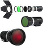 The Godox Barndoor Kit for AD300Pro Outdoor Flash contains a 4-way barndoor set, honeycomb grid, and one each, green, blue, red, and yellow filter. The barndoors allow you to light areas of the subject you want to and keep light from areas that you don't want illuminated. The grid narrows the beam spread into a soft-edged circle which is ideal for uses like hair lighting. The color filters are provided for creative expression.